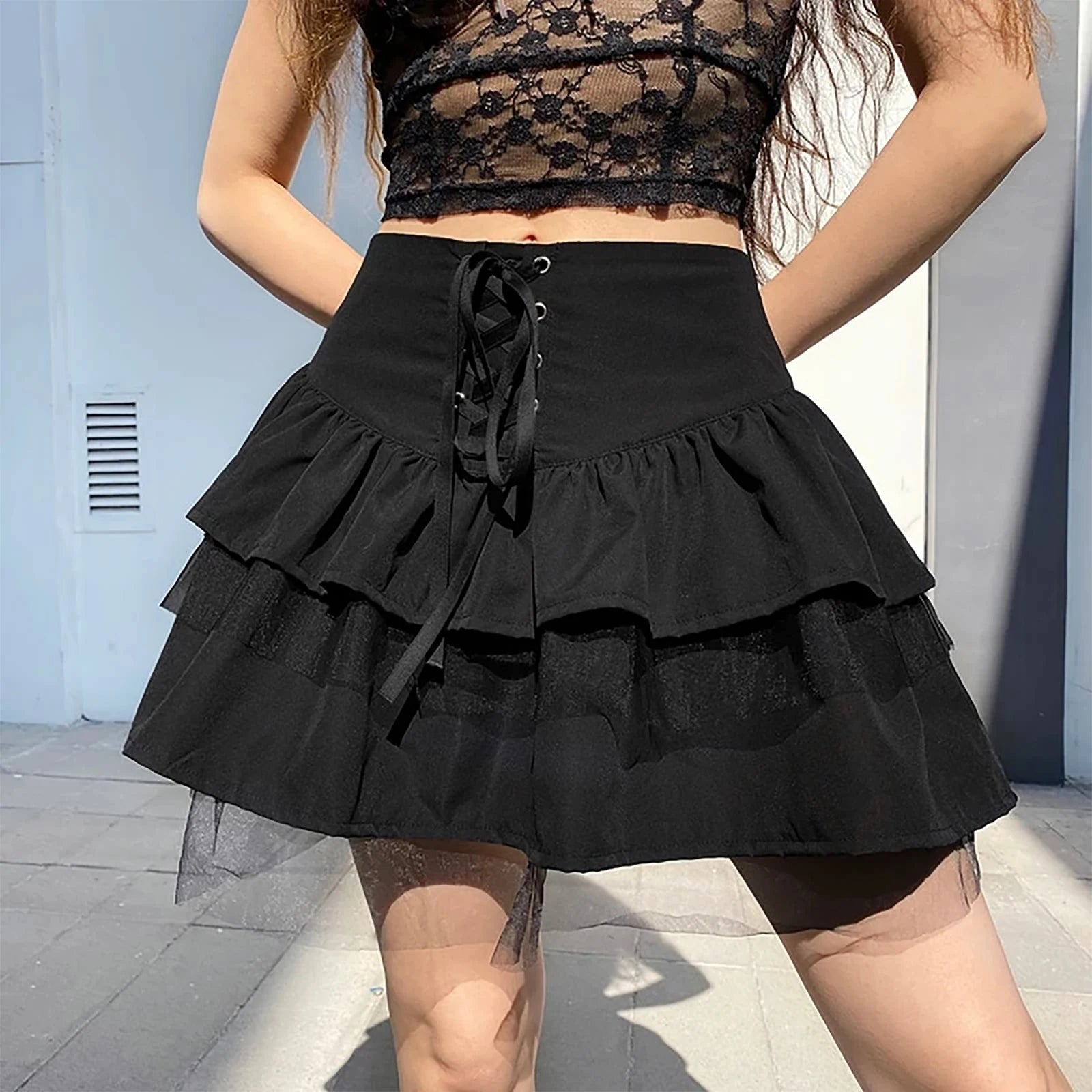 Women Mini Skirt Sweet High Waist Lace-Up Stitching Tulle Skirt Summer Street Style Lady Mini Ruffles Tutu Skirts A-line